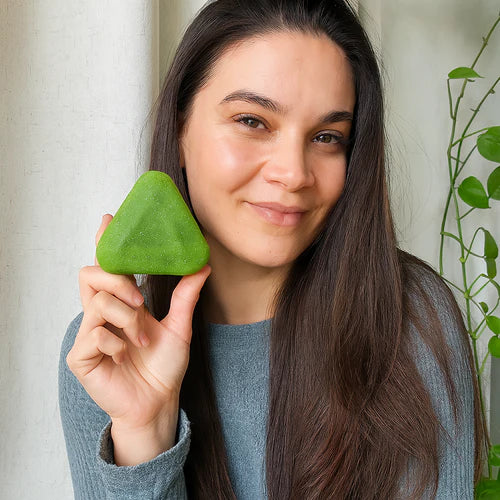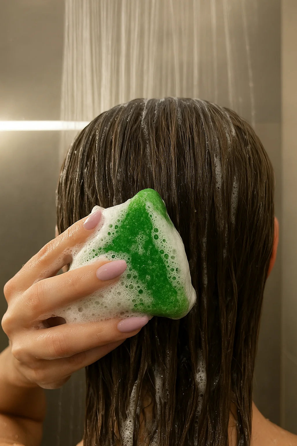 Con el cabello completamente húmedo, frota el champú sólido directamente sobre el cuero cabelludo haciendo movimientos circulares suaves hasta que se forme espuma.